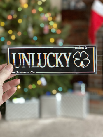 Slap sticker with the text "Unlucky" on it. Contains multiple colors to give a glitch effect to the text.